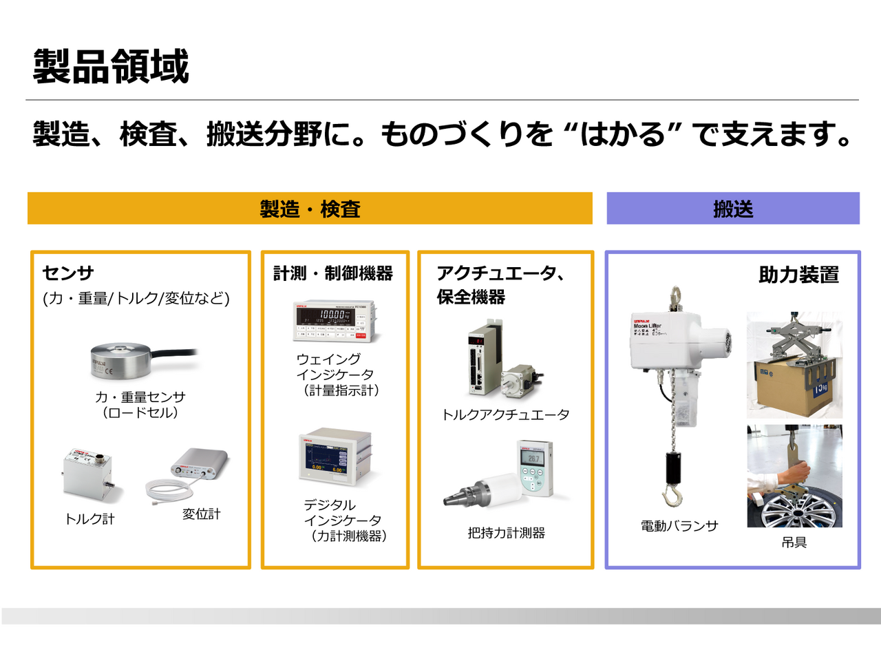 社名の通り、世界に先駆けてウェイングインジケータ(計量指示計)を製品化したほか、回転トルクメータ「UTM」シリーズはシャフト型トルク計測のスタンダードになった。製品群のすそ野を広げ、近年は重量物のハンドリングをアシストする電動バランサも事業の柱に育ちつつある。